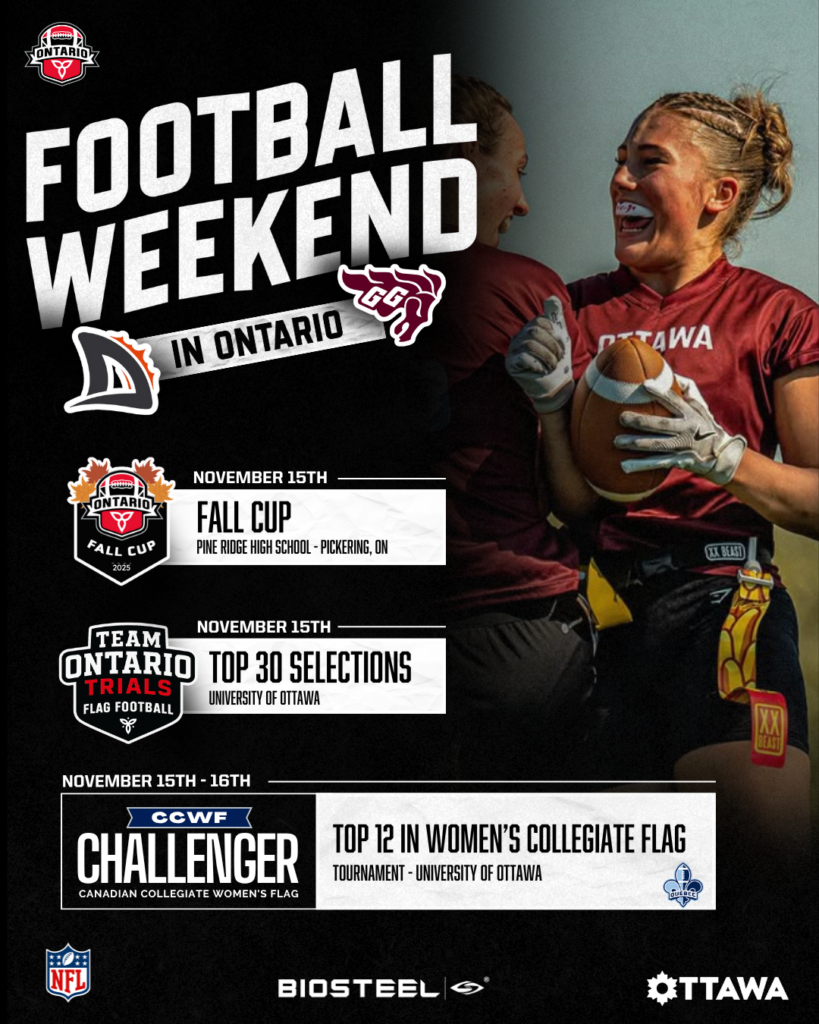 “Football Ontario is thrilled to host the fourth annual Football Weekend in Ontario, showcasing the incredible football talents both in our province and across the country. From the 2025 Fall Cup Provincial Championships, the Canadian Collegiate Women’s Flag Showcase, to our Team Ontario Flag Camps this week will unite football enthusiasts of all ages and skill levels. We hope that you join us in celebrating the game of football both in Ottawa and in Pickering later next month” says Tyler McNicholl, Director of Operations, Football Ontario.