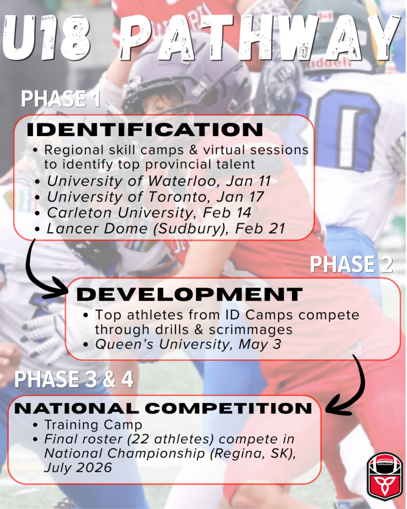 Following these phases the final U18 Team Ontario roster will be selected to form the team that will take part in the 2026 Women’s U18 Tackle National Championship in Regina. Stay tuned for Football Canada’s formal announcement on this event.